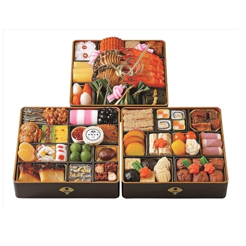 きんぴらまぐろ、鶏松風、伊達巻、菊かぶら、海老の旨煮、鮑旨煮、数の子醤油漬、にしん昆布巻、巾着餅、紅白松笠烏賊、千代結び蒲鉾
