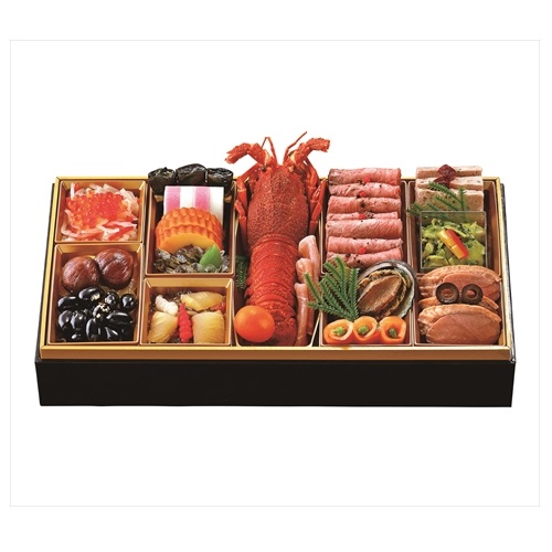 紅白京風なます・いくら醤油漬・昆布巻・紅白蒲鉾・伊達巻・田つくり・若桃甘露煮・ロブスターボイル・生ハム・和牛のローストビーフ・椎茸旨煮・テリーヌヴィアンド・ドライクランベリー・あかにし貝のバジルソース・2種のパプリカピクルス・薩摩芋金団・栗渋皮煮・黒豆蜜に(金箔)・松前漬・数の子醤油漬・紅白千代呂ぎ木・金柑蜜煮・鮑旨煮・コルニッションピクルス・スモークサーモンケーパー添え・合鴨山椒焼