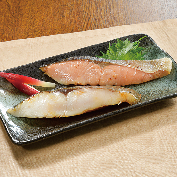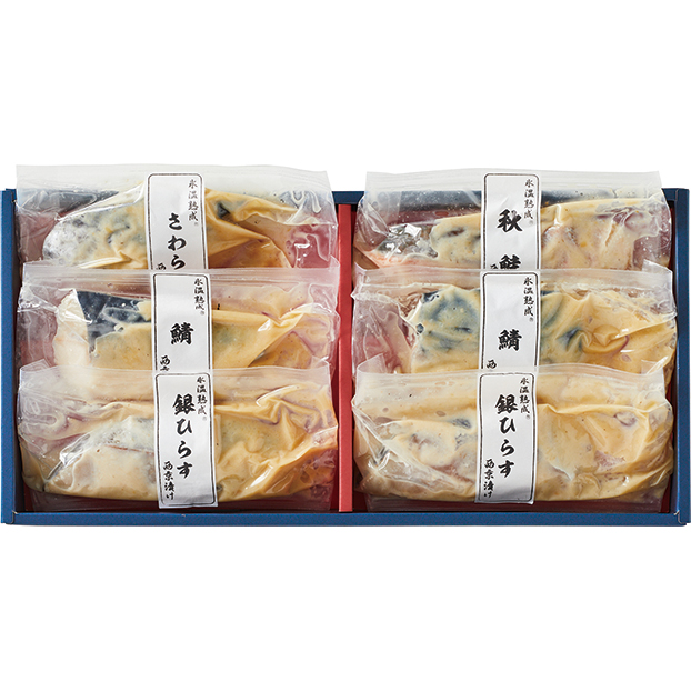 銀ひらす(ニュージーランド産)60g×2、鯖(ノルウェー産)60g×2、秋鮭(国産)60g×1、さわら(国産)70g×1 自家製の味噌に漬け込みじっくりと氷温熟成。香り高く芳醇な味わいの西京漬けに仕上げました。