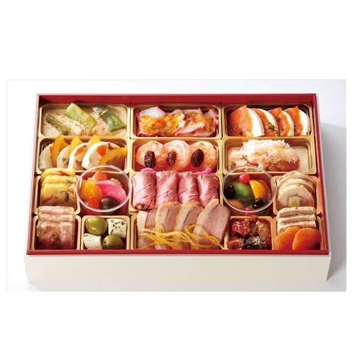 フルーツフロマージュのテリーヌ、アンズのコンポート、タコのラビゴットソース、ダイコンとサーモンのマリネ、生ハム、ハーブクリームチーズ、合鴨スモーク、レンズ豆の煮込み、小海老の白ワイン蒸し、オレンジコンフィ、人参のマリネ、ボイル平さやインゲン、ベーコンとほうれん草のフリッタータ、ボローニャハムのゼリー寄せ、ピクルスの盛り合わせ(ヤングコーンのピクルス、人参のピクルス、パプリカのピクルス、ブラックオリーブ、カブのピクルス)、ローストビーフ赤ワイン漬、紫キャベツとクランベリーのマリネ、スモークサーモンと玉葱のマリネディル風味、豚肉と鶏肝のパテ、ラタトゥイユ、グリーンオリーブのハーブオイル漬、モッツアレラチーズのハーブオイル漬、ココナッツ餡の白きんとん、渋皮栗甘露煮、鶏肉のハニーマスタード、白いんげん豆のトマト煮