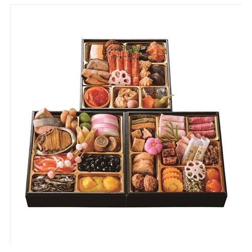 市松錦玉子・ホタテの炙り焼・一口昆布巻・鯛の南蛮漬・鰤の幽庵焼・海老の姿煮・松笠イカの醤油麹焼・椎茸の旨煮・花れんこん・いくら醤油漬・スモークサーモントラウト・焼湯葉の含め煮・手毬麩煮・子肌の酢漬け・梅人参煮・ひょうたん漬け
