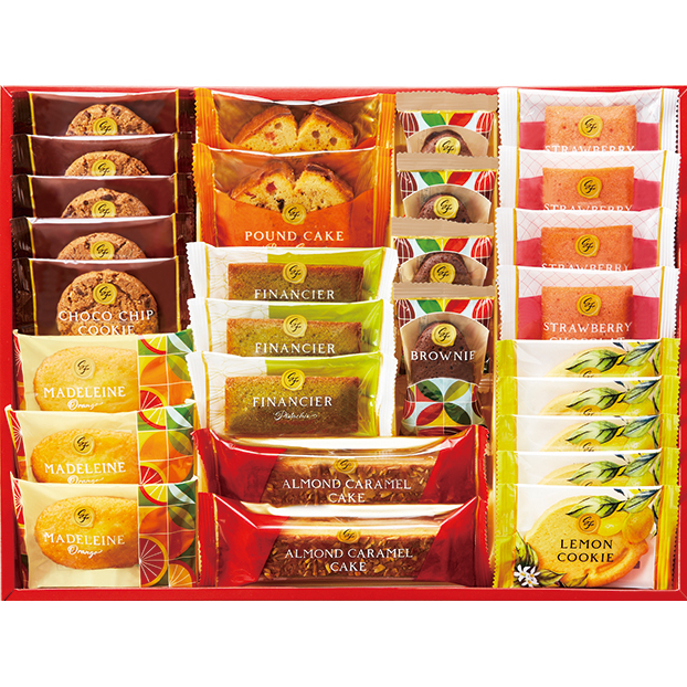 オレンジマドレーヌ×3、ストロベリーショコラケーキ×4、ピスタチオフィナンシェ×3、ブラウニー×4、ブラウンシュガーパウンドケーキ×2、アーモンドキャラメルケーキ×2、チョコチップクッキー×5、レモンクッキー×5 -