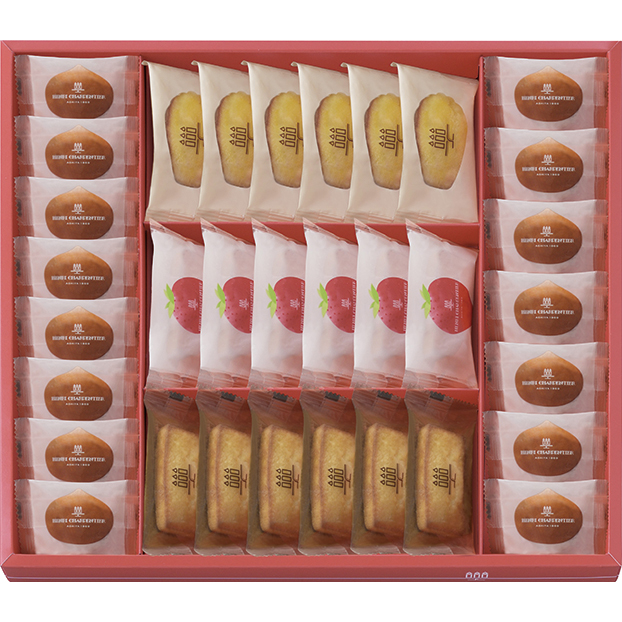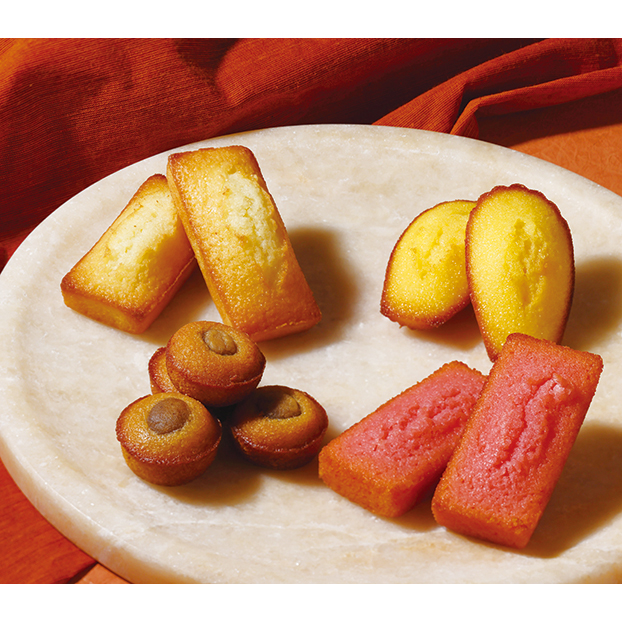 フィナンシェ×6、マドレーヌ×6、神戸二郎いちごフィナンシェ×6、兵庫丹波産栗おどるマロンケーキ×15 ルビーのような艶やかな光沢とすっきりとした甘さが特長の二郎いちごと、柔らかく甘みに優れた丹波産の栗を使用した焼き菓子のセットです。