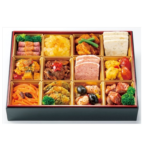 ローストビーフグレービーソース添え・ブロッコリーコンソメ煮・りんごきんとんシナモン風味・スパイスグリルチキンインゲン添え・ホタテのテリーヌ・ミートローフのラタトゥイユソース添え・椎茸入りビーフシチュー・テリーヌドカンパーニュ・カジキのハニーマスタードソース・ドライトマト赤ワイン煮・キャロットラぺ・エビのバジルマヨソース・たこのマリネバジル風味・オリーブのマリネ・鴨のスモーク