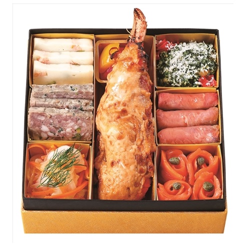 オマール海老のテルミドール、ローストビーフ(サーロイン)、ローストビーフソース、帆立貝のジェノベーゼ トマトソース添え(バジル・ほうれん草・カシューナッツ・パルメザンチーズ・アンチョビ・ニンニク)、シーフードテリーヌ(サーモン・ピスタチオ入り)、海老のエスカベッシュ、ディル、スモークサーモン、ケッパー、鴨のテリーヌ ピスタチオ入り、レッドオニオンとイエローパプリカのピクルス
