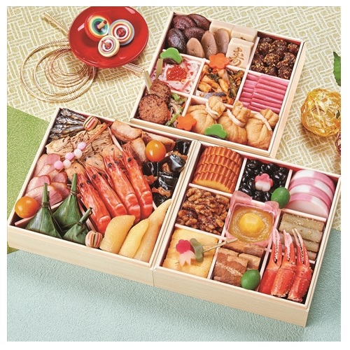 伊達巻、黒豆、梅餅、紅白蒲鉾、鰹くるみ、栗きんとん、たたきごぼう、だし巻、豚角煮、蟹爪柚庵焼、若桃甘露煮、お祝い松葉串
