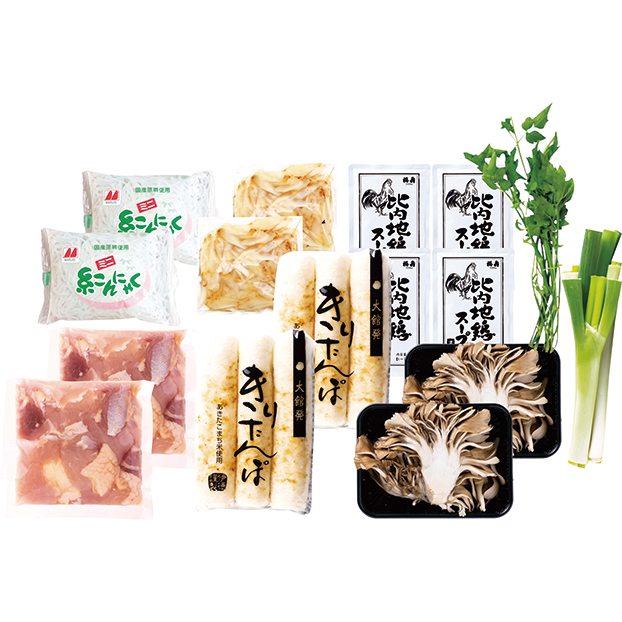 きりたんぽ90g×6、比内地鶏スープ(2倍濃縮タイプ)250g×4、比内地鶏(肉)300g、舞茸200g、セリ120g、長ネギ2本分、ささがきゴボウ200g、糸こんにゃく240g あきたこまち100%の肉厚きりたんぽ、芳醇な味わいの比内地鶏のスープ、比内地鶏肉を味わえるセットです。