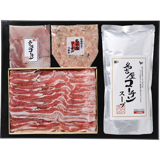 豚バラ肉240g、名古屋コーチンモモ肉とムネ肉切身200g、名古屋コーチンつみれ200g、名古屋コーチンスープ600ml 鶏ガラから炊き出した名古屋コーチンスープと豚肉、鶏肉の旨味が絡みあうちゃんこ鍋セットです。