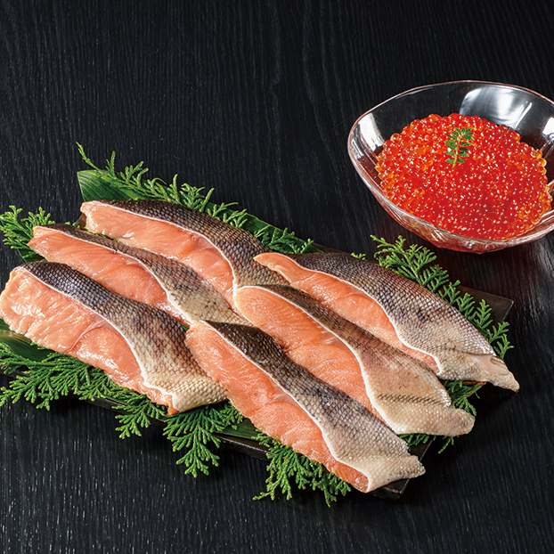 いくら醤油味100g×2、秋鮭切身70g×6 北海道の秋鮭はさっぱりした味わいが特長、いくらは秘伝の有機醤油タレに漬け込んで味付けをしています。
