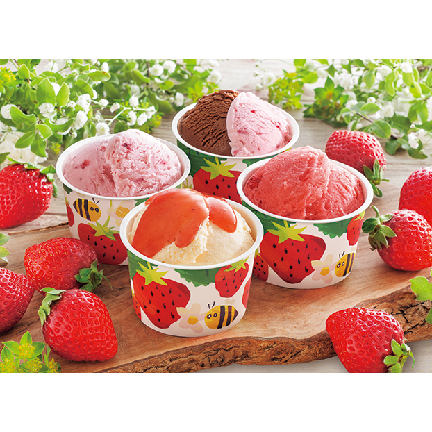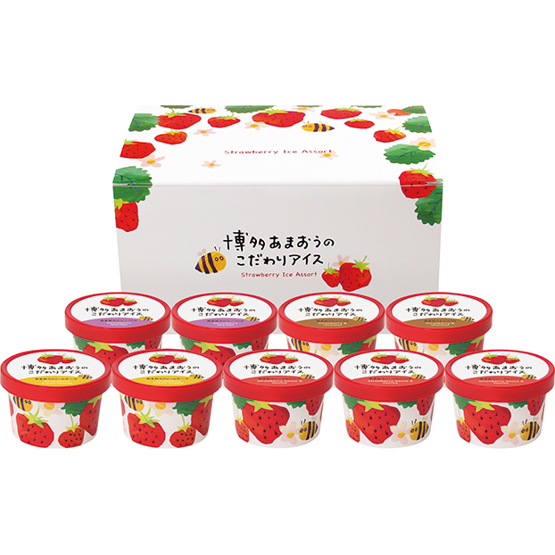あまおうソース&バニラ58ml×3、あまおう&ショコラ76ml×2、あまおうクリームチーズ・あまおうシャーベット各78ml×各2 福岡の農家さんが愛情たっぷりに育てた「博多あまおう」をとことん楽しむアイスです。