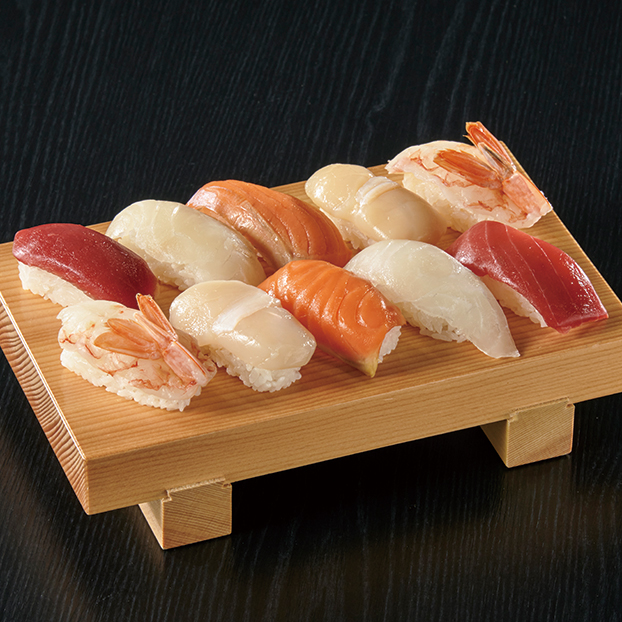本鮪・真鯛・サーモン・ホタテ・赤エビ×各2 いつでも簡単に美味しく召し上がれるお鮨はいかがでしょうか。目利きの鮮魚バイヤーが厳選したネタを瞬間冷凍。シャリにもこだわっています。