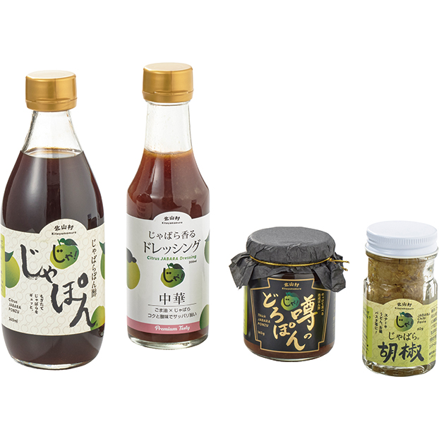 じゃばらぽん酢じゃぽん360ml×1、噂のどろぽん140g×1、じゃばら香る中華ドレッシング200ml×1、じゃばら胡椒60g×1 -