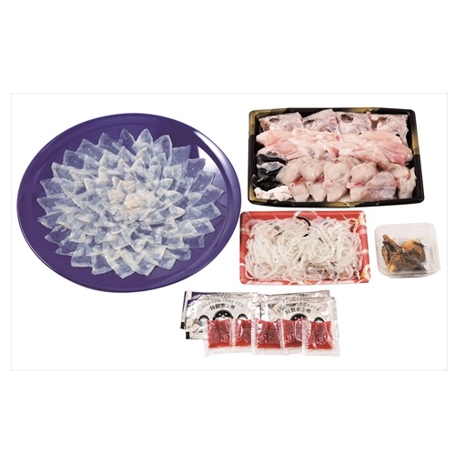 4~5人前(とらふぐ刺身140g(25cm皿)、ちり鍋用600g、本皮100g、焼きひれ5g、ポン酢)