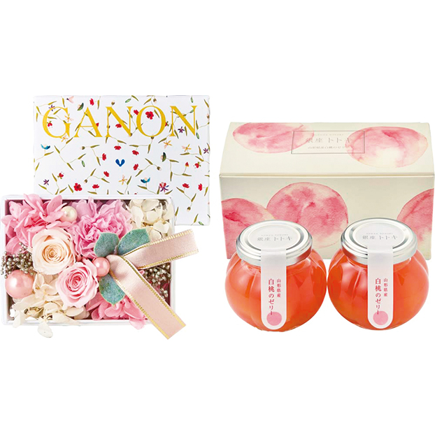 「GANON FLORIST」が監修したプリザーブドフラワーと山形産白桃の入った「銀座トトキ」監修のゼリーをセットでお届け。