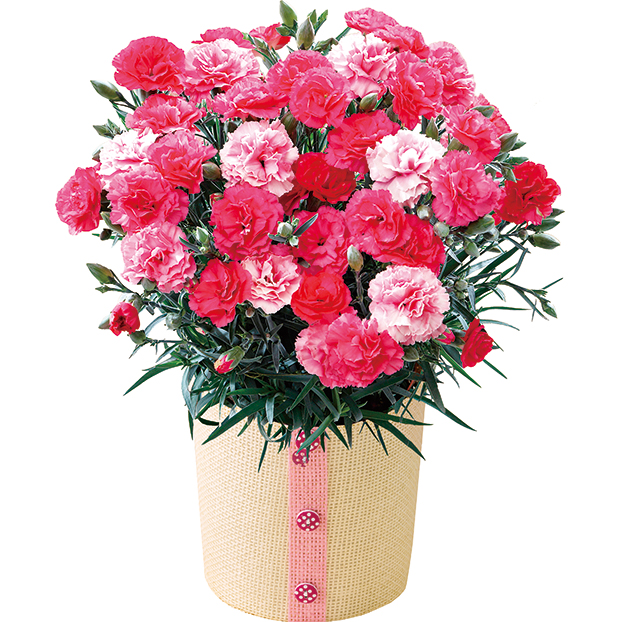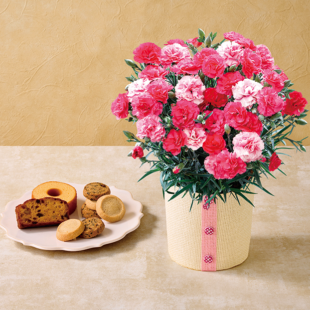 さまざまなピンク色が楽しめる八重咲きのカーネーションと「パティスリーキハチ」の焼菓子をセットでお届けします。